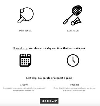 Then we designed a marketing page on Weebly. This page simply describes the purpose of the app and includes a "get the app" call-to-action button. In order to make the home page more effective, we implemented A/B testing on it with Google Content Experiments and Google Analytics. We also launched a Google Adwords campaign to drive traffic through the website and to learn about the usual keywords used by our potential users. Below you can see the two different home pages: both have the same header (picture + short text describing the purpose of the app) and the “Get the app” call-to-action button. Home A (on the left) also includes a description of how the application works. It explains the three main steps the user will have to go through to find an opponent.